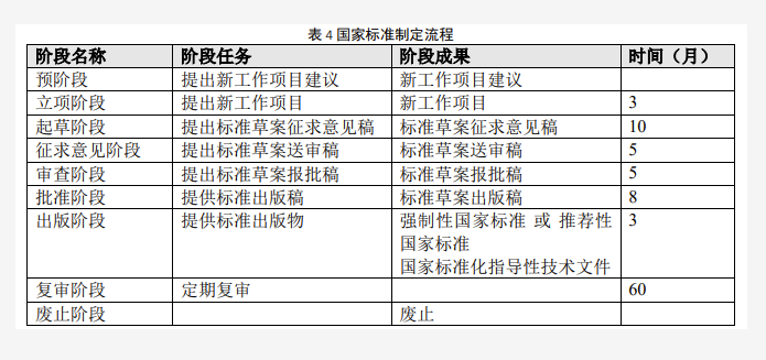 標(biāo)準(zhǔn)出版階段自國家標(biāo)準(zhǔn)出版單位收到國家標(biāo)準(zhǔn)批準(zhǔn)發(fā)布稿起, 至國家標(biāo)準(zhǔn)正式出版止。出版階段周期一般不超過 3 個(gè)月。國家標(biāo)準(zhǔn) 實(shí)施后,應(yīng)根據(jù)科學(xué)技術(shù)的發(fā)展和經(jīng)濟(jì)建設(shè)的需要適時(shí)進(jìn)行復(fù)審,復(fù)審周期一般不超過 5 年。國家標(biāo)準(zhǔn)復(fù)審后,對不需要修改的國家標(biāo)準(zhǔn)可確認(rèn)其繼續(xù)有效;對需要修改的國家標(biāo)準(zhǔn)可作為修訂項(xiàng)目申報(bào),列入國家標(biāo)準(zhǔn)修訂計(jì)劃;對已無存在必要的國家標(biāo)準(zhǔn),由標(biāo)準(zhǔn)化技術(shù)委員會(huì)或部門提議,報(bào)國家標(biāo)準(zhǔn)委批準(zhǔn)后廢止。