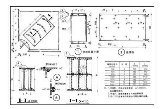 (1)空調(diào)風管長邊尺寸大于500mm直角彎頭應加導流片。導流片的弧度應與彎管角度相一致。風管轉彎半徑一般R=D。矩形短半徑彎頭應加導流葉片,導流葉片厚度為風管的兩倍,不小于60mm,片數(shù)不得少于兩片。
