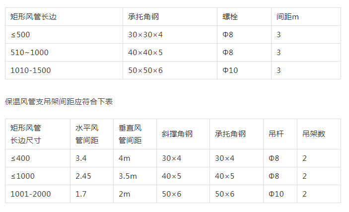 風管支吊架間距(不保溫風管)應符合下表: