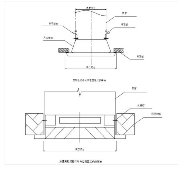 19、在安裝風口時,注意風口與所在房間內(nèi)線條一致。尤其當風管暗裝時,風口要服從房間線條。吸頂安裝的散流器與吊頂平齊。風口安裝要確保牢固可靠。