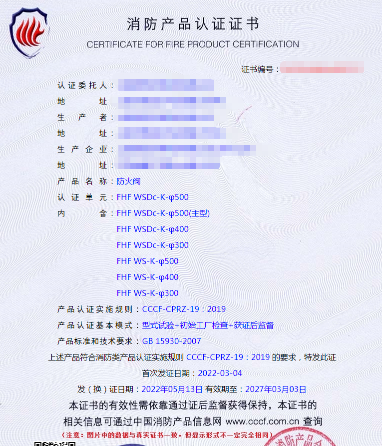 防火閥3C認證,產(chǎn)品標準和技術要求:GB 15930-2007 ,產(chǎn)品認證實施規(guī)則:CCCF-CPRZ-19:2019 。其認證證書樣式如下圖(證書有效期5年,到期后另再延續(xù)):