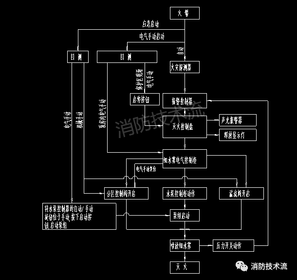 ?。?)自動控制:防護區(qū)內(nèi)一路探測器報警后,滅火控制器發(fā)出聲光警報信號,當兩路探測器報警確認火災后,滅火控制器驅(qū)動防護區(qū)內(nèi)外的聲光警報器,經(jīng)30s延時發(fā)出滅火指令至細水霧裝置控制柜打開對應區(qū)域的分區(qū)控制閥,并發(fā)出啟泵信號至水泵控制柜,啟動系統(tǒng)實施滅火。壓力開關動作后,反饋動作信號滅火控制器聯(lián)動點亮防護區(qū)入口處的噴放指示燈。開式系統(tǒng)的響應時間不應大于45s。